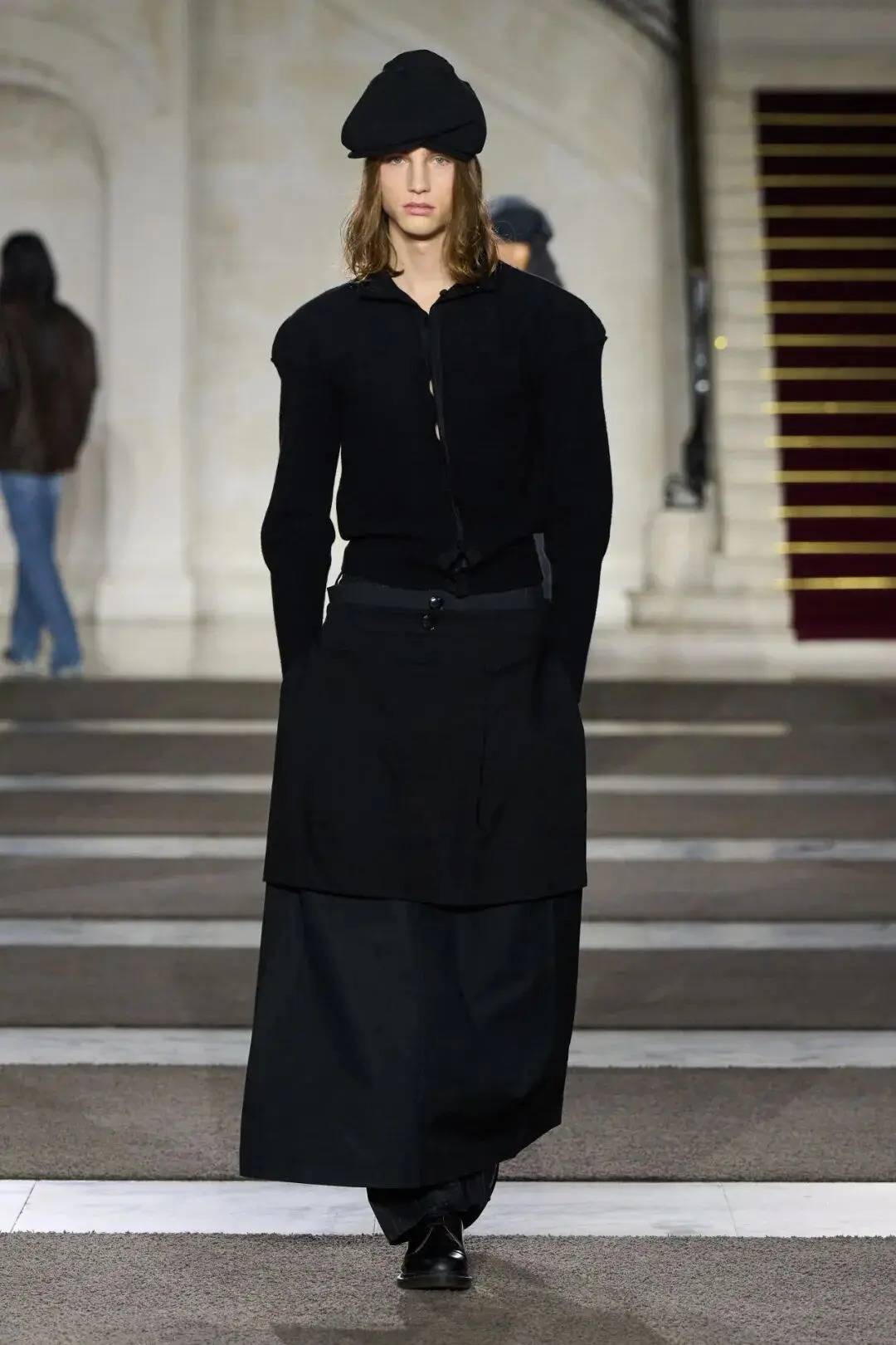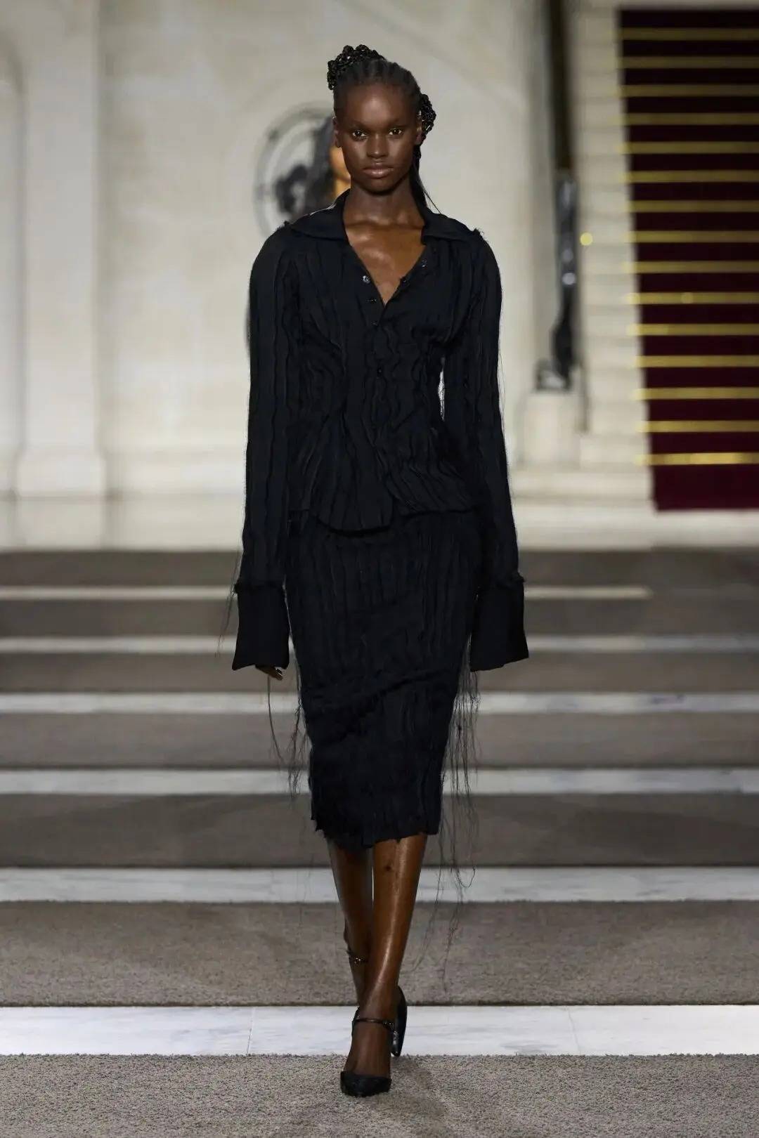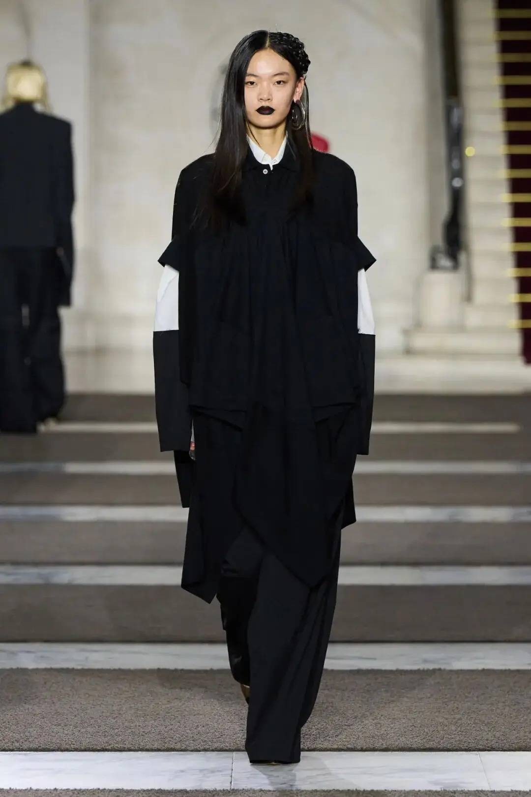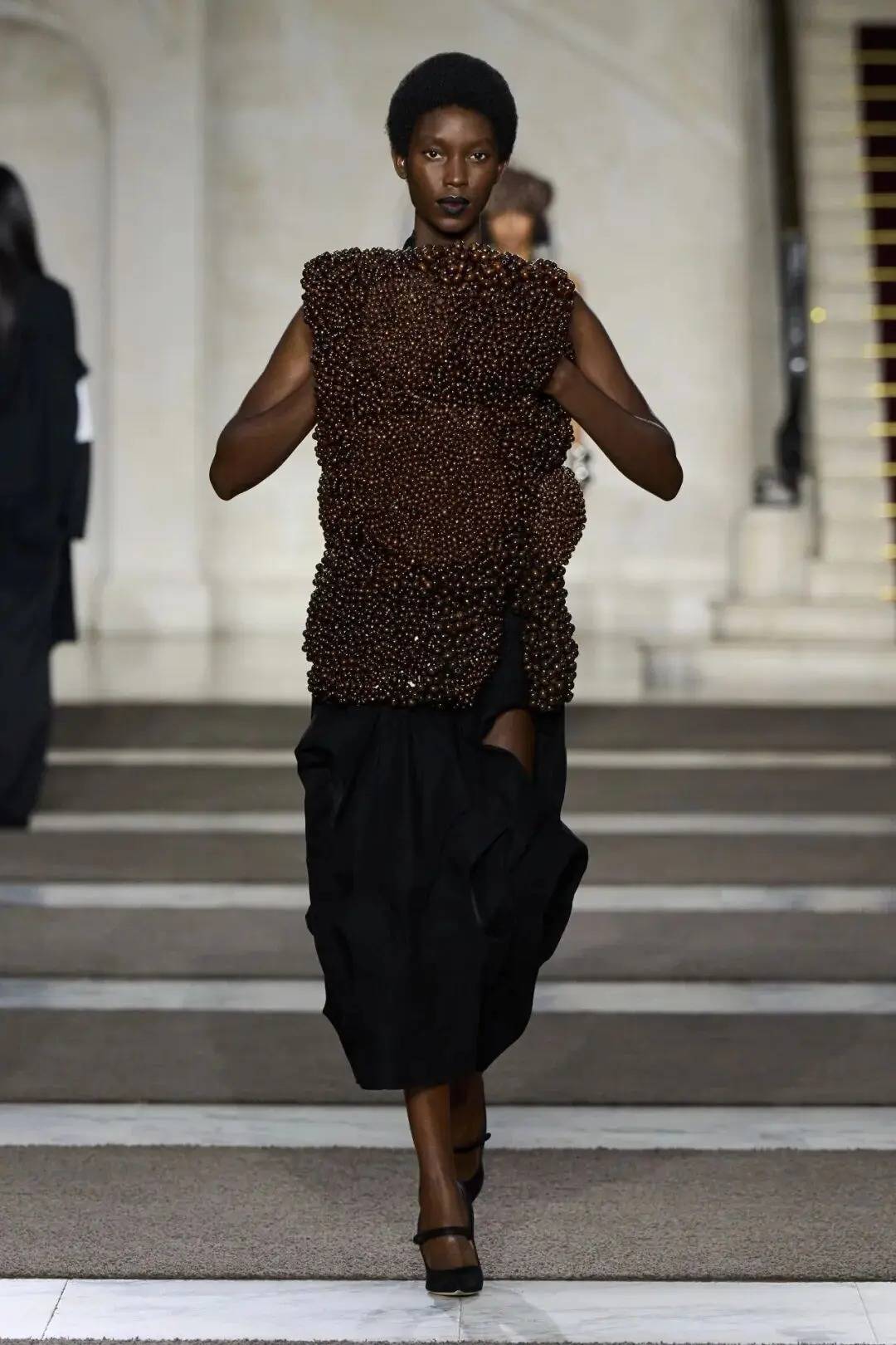 细节之处尽显巧思:木珠装饰不仅是对北欧文艺复兴的致敬,更探索了“如此自然的东西如何在数字时代变得空洞”;军装元素的运用独具特色,例如超中尉风格的罗纹羊毛衫与不对称荷叶边裙的搭配;牧师式长袍这一独特单品,采用男装衬衫面料制成,巧妙融合了神圣与世俗的元素。在色彩方面,以中性色调为主,少量鲜艳色彩作为点缀。