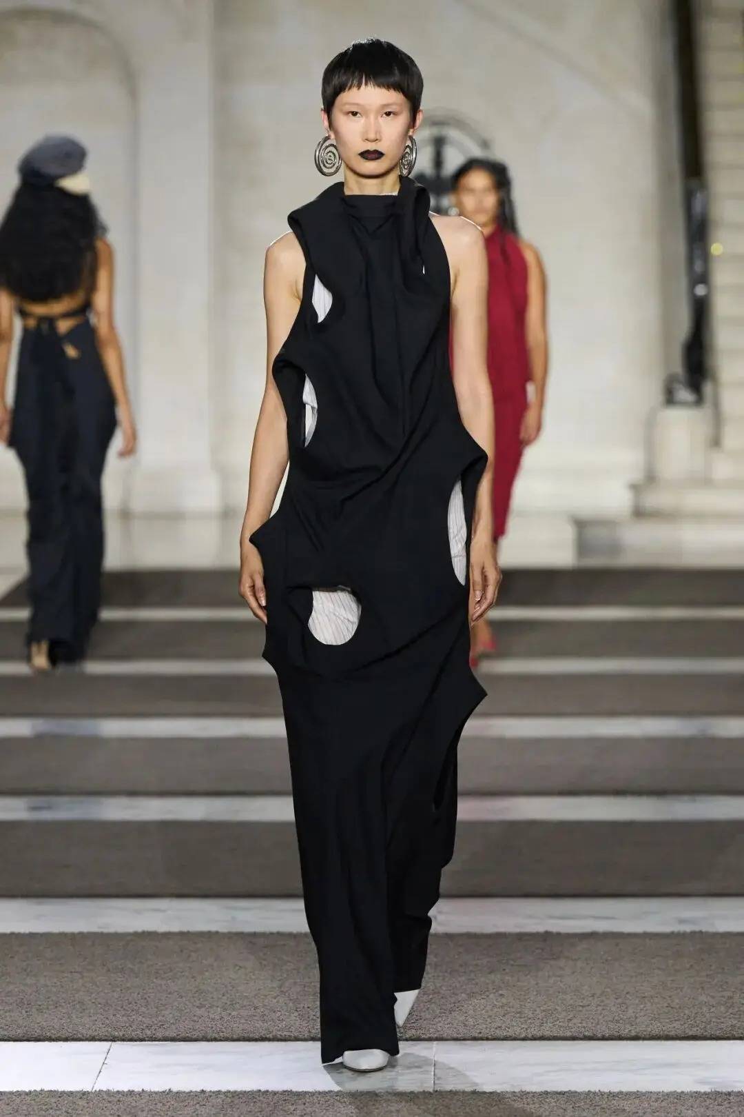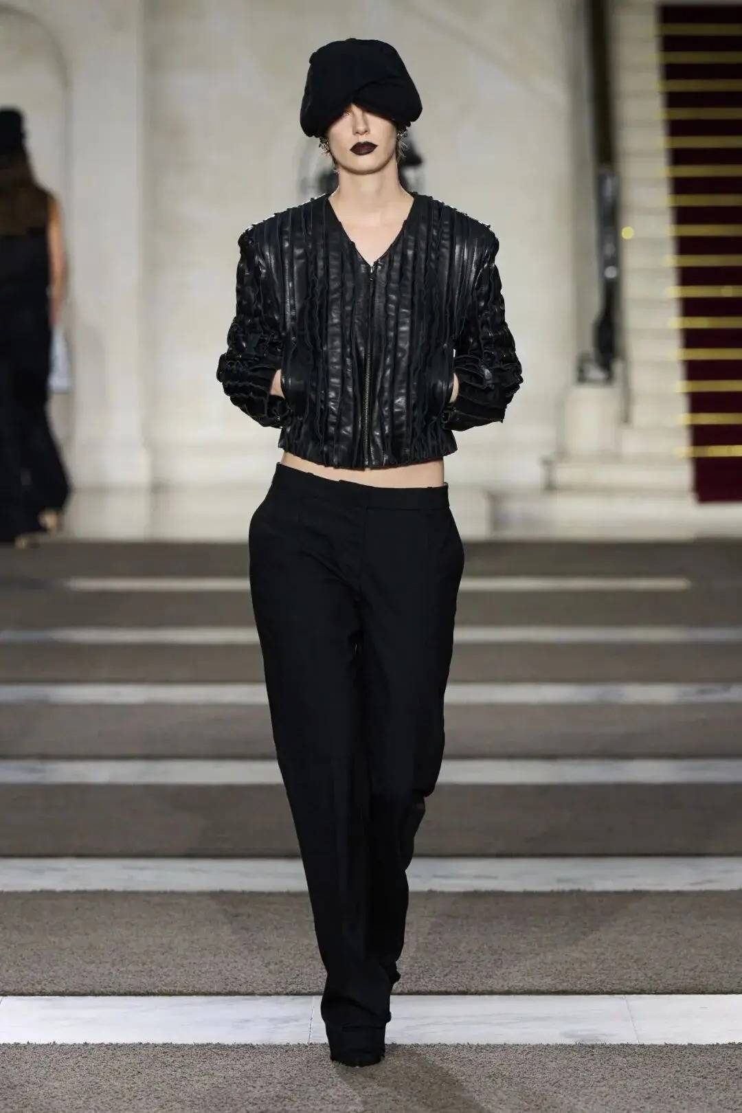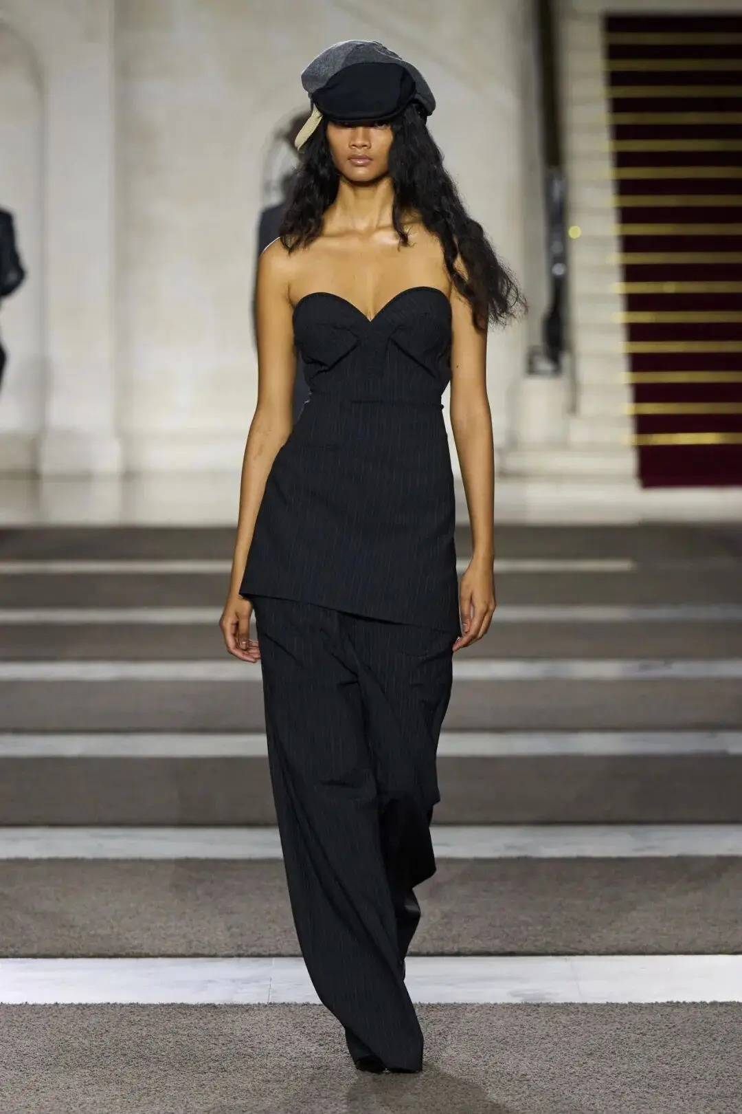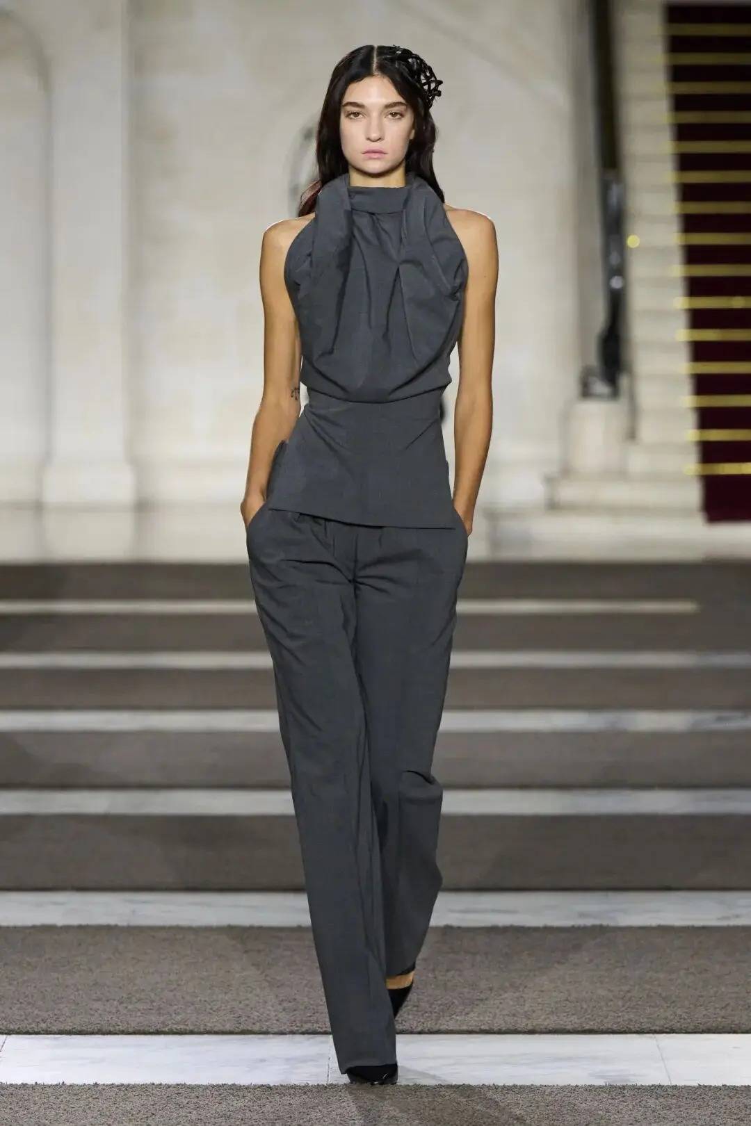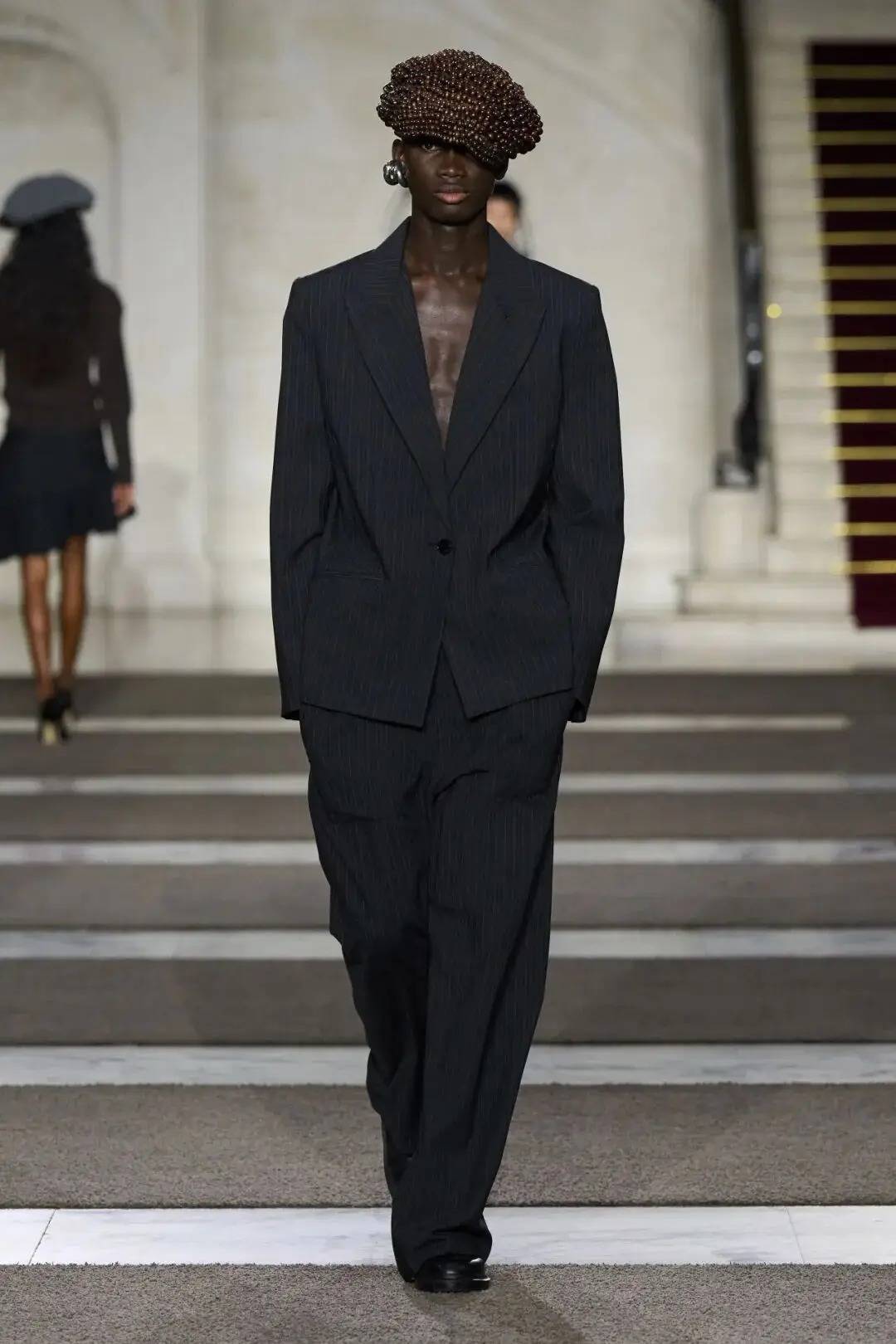 细节之处尽显巧思:木珠装饰不仅是对北欧文艺复兴的致敬,更探索了“如此自然的东西如何在数字时代变得空洞”;军装元素的运用独具特色,例如超中尉风格的罗纹羊毛衫与不对称荷叶边裙的搭配;牧师式长袍这一独特单品,采用男装衬衫面料制成,巧妙融合了神圣与世俗的元素。在色彩方面,以中性色调为主,少量鲜艳色彩作为点缀。