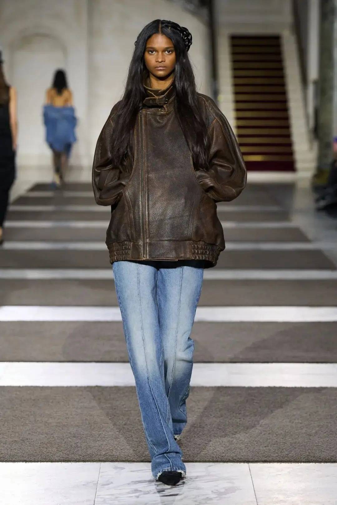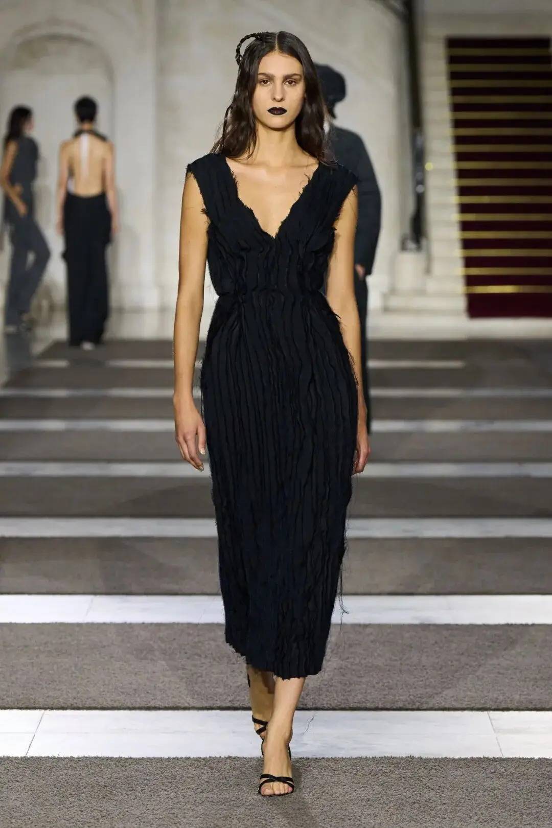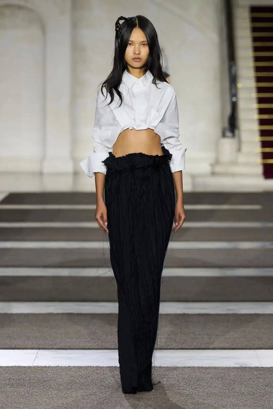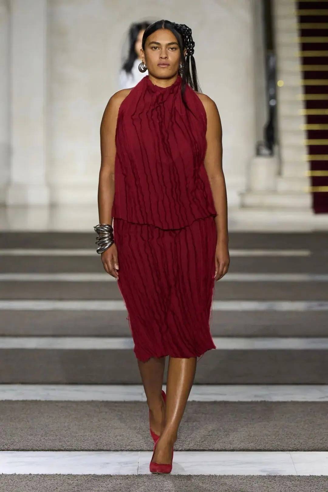 细节之处尽显巧思:木珠装饰不仅是对北欧文艺复兴的致敬,更探索了“如此自然的东西如何在数字时代变得空洞”;军装元素的运用独具特色,例如超中尉风格的罗纹羊毛衫与不对称荷叶边裙的搭配;牧师式长袍这一独特单品,采用男装衬衫面料制成,巧妙融合了神圣与世俗的元素。在色彩方面,以中性色调为主,少量鲜艳色彩作为点缀。