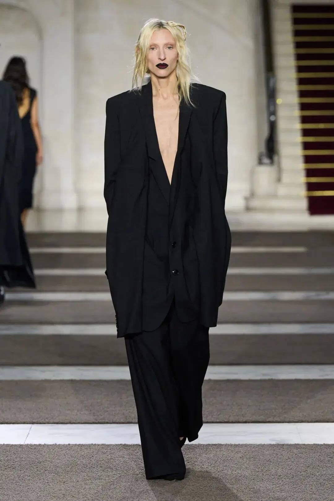 标志性设计元素独具魅力:解构与重构手法的运用十分精妙,扭曲的袖子、翻转的衣领、穿孔的面料,营造出“服装逻辑矩阵中的视觉故障”;突变剪裁(mutated tailoring)别具一格,特意让接缝处起皱的针织面料,搭配融合不同西装元素的下装;材质对比鲜明,硬挺与柔软、有机与人工材质相互碰撞;不对称设计为传统轮廓注入不稳定感,比如不对称荷叶边裙。
