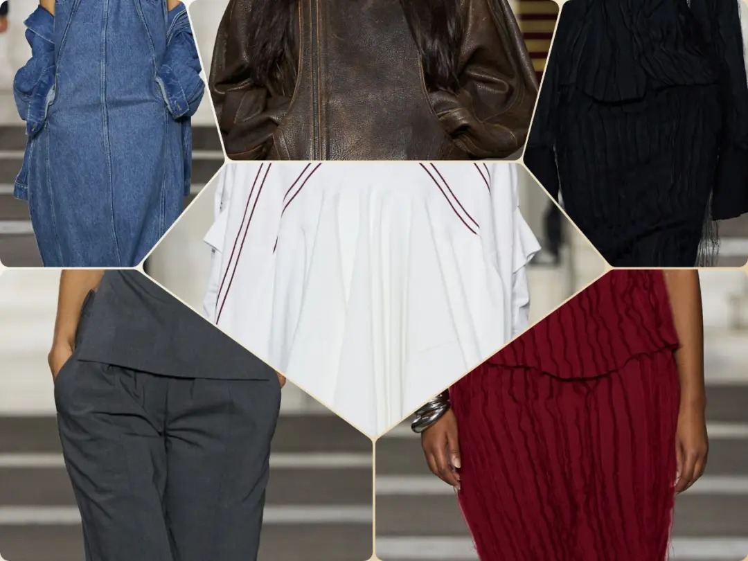蓝色系服装在清冷色调中,结合牛仔面料增添了材质的纹理质感。在蓝色牛仔裙装中,优雅温婉的气质尽显,高领设计、拼接线条、露肩设计、夸张造型等元素的结合,更为其增添了不少时髦设计感。白色短款上衣改良自衬衫元素,短款设计拉高了腰线,增加了小蛮腰线条的时髦感,打结褶皱等设计细节满满。深色系的黑棕色服装低调沉稳,纯色简约中尽显裙装的优雅温婉气质,挂脖设计、堆叠随性的褶皱带来更多时尚感。