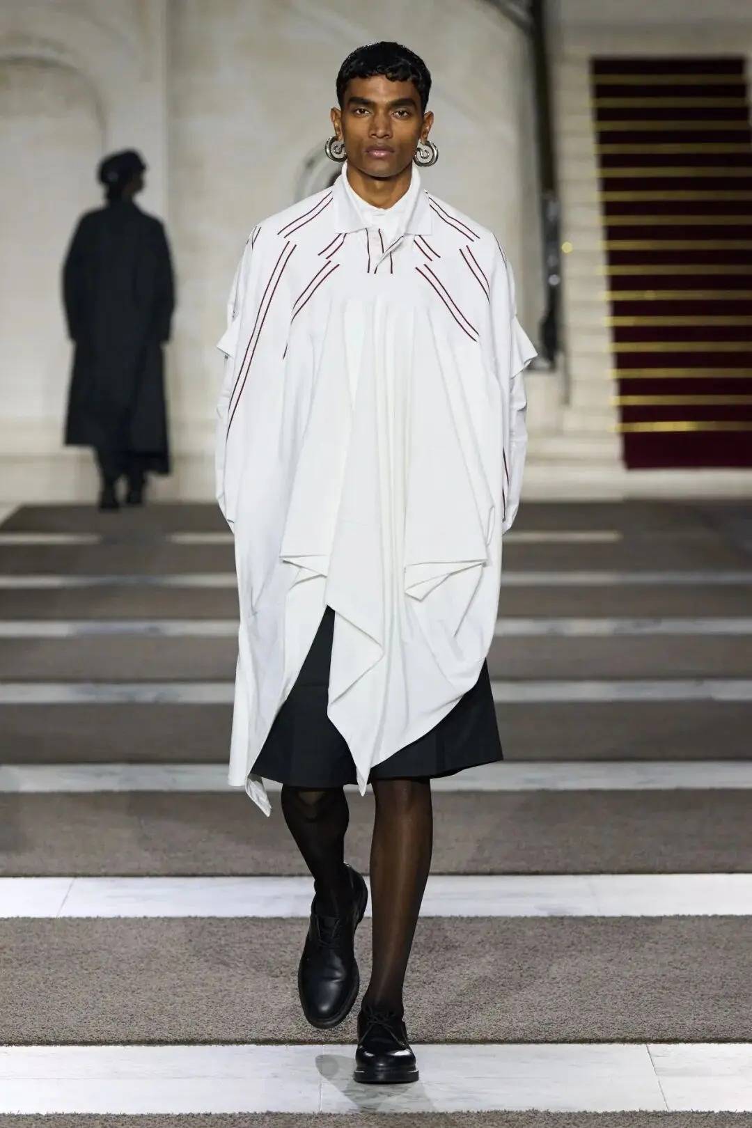 其灵感来源丰富多元。一方面,源于阿尔布雷特·丢勒的艺术,该系列深入探讨了“神圣与世俗、混乱与控制、身体与系统”之间的张力。另一方面,汲取了当代生活中独特的“uncanny feeling”(诡异感),即事物看似熟悉却又透着陌生,宛如现实世界中出现的“视觉故障”。并且,丢勒作品中对细节的极致追求与Torishéju本人对“pattern cutting(版型剪裁)”的痴迷相互呼应。设计师自述道:“这是关于一种模糊的制服,以颠覆的方式审视制服。就像生活中发生的事情,你几乎需要歪着头思考‘哦,好吧’,这就是我希望这些衣服所代表的感觉。”